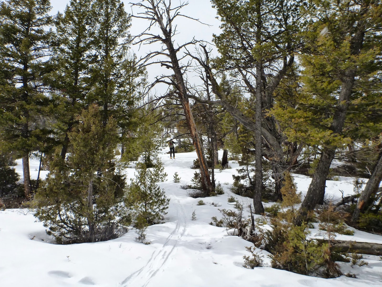 We ducked into the loop at the upper Mammoth Hot Springs in hopes that we could then head up. Meh. Nothing special, unless you count practicing putting on skins, maneuvering over brush and downed trees, taking off skins, and not tripping over downed trees on the way back. Which is good practice.